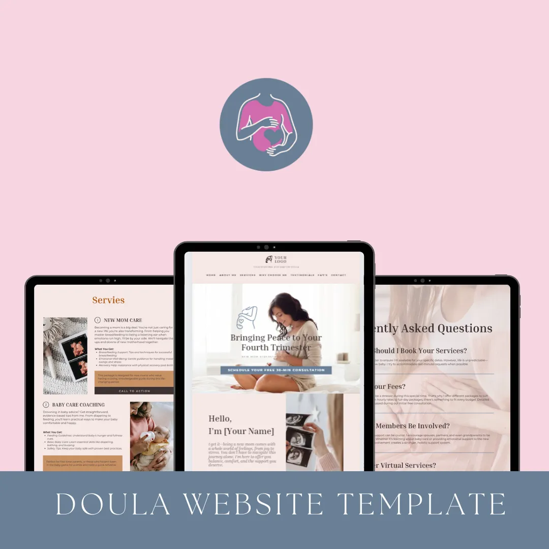 Set up a professional online presence with ease using this template, designed to attract clients with a clean layout, showcasing your doula services effectively showcasing services, testimonials, and contact information.