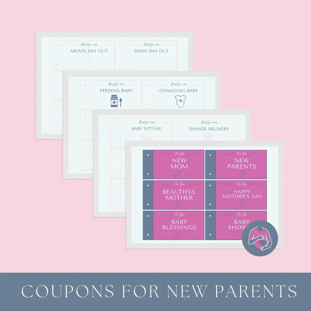 Creative coupon book templates offering new parents helpful services and gestures, perfect as a thoughtful gift. A thoughtful and practical gift, these coupons offer services like meal prep, babysitting, and house cleaning, providing support and relief to new parents.