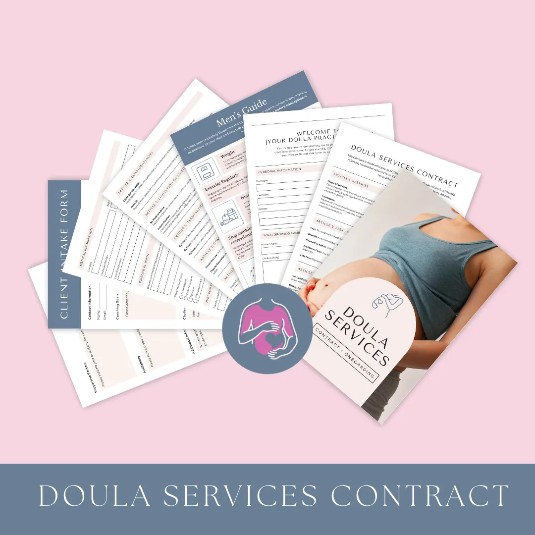 A customizable contract template outlining the terms and services provided by doulas, ensuring a smooth working relationship with your clients with this contract template, covering Intake forms, services, expectations, and boundaries in a clear and professional manner.