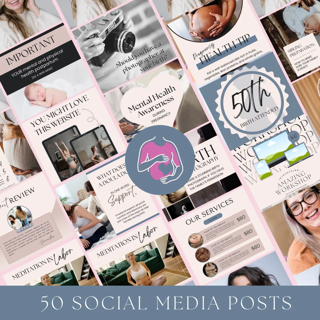 Engaging social media post templates for doulas to connect with clients, share insights, and promote their services. Boost your engagement with these ready-to-post designs, perfect for sharing valuable pregnancy and birth information, tips, and promoting your doula services.